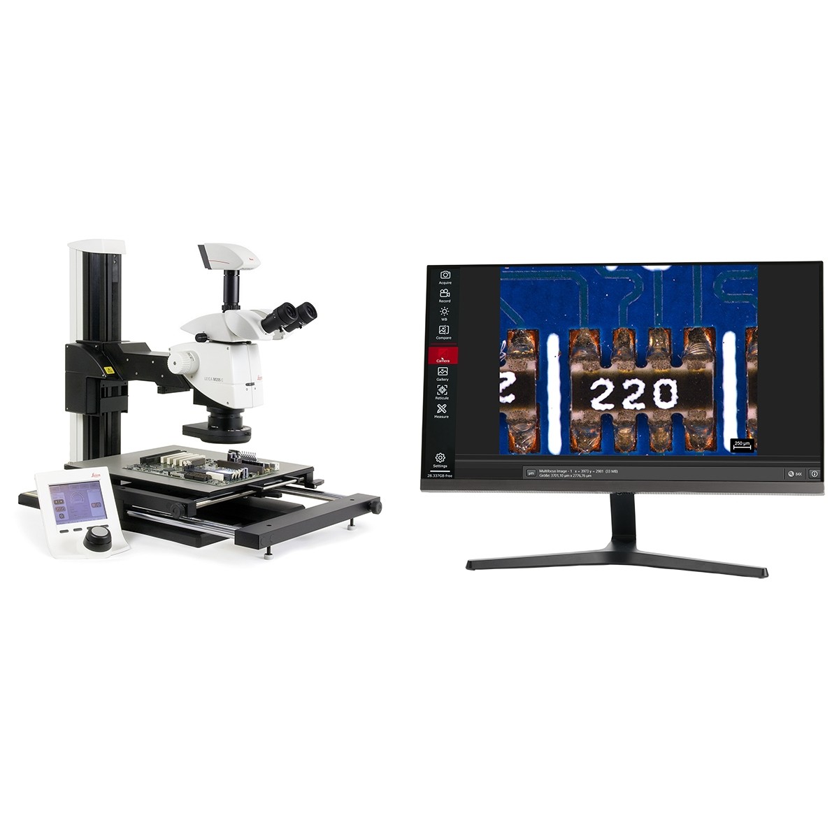 Standard-PaketErgo-Paket3D-PaketHigh-End Optik mit höchster Auflösung in Kombination mit großem Arbeitsabstand✔✔✔Apochromatischer Zoom für eine 100% farbechte Darstellung✔✔✔Zuverlässige Messungen durch codierte Optik (die Vergrößerung wird von der Software automatisch ausgelesen)✔✔✔Motorfokus für eine präzise Fokussierung, inklusive 5 speicherbaren Fokuspositionen✔✔✔Größe der XL-Basisplatte600 x 400 mm600 x 400 mm600 x 400 mmXL-Gleittisch (300 x 300 mm Verfahrweg, Fein- und Schnellverstellung, inkl. ESD Schutzmatte und Erdungsanschluss)◯◯◯Ergo-Tubus mit Winkelverstellung für eine komfortable Körperhaltung–✔✔Modernes LED-Ringlicht mit einzeln schaltbaren Segmenten✔ (weitere Beleuchtungen optional)✔ (weitere Beleuchtungen optional)✔ (weitere Beleuchtungen optional)Polarisations-Set zur Minimierung von Lichtreflexen◯◯◯Besonders präzise Messungen durch AX-Träger◯◯✔Hochauflösende Leica Kamera✔ (Leica Flexacam C3)✔ (Leica Flexacam C3)✔ (Leica K3C für besonders schnelle 3D-Bildaufnahme)Leistungsfähige Software mit Mess-, und Tiefenschärfe-Funktion✔✔✔Software mit 3D-Darstellung und umfangreichen 3D-Messfunktionen◯◯✔